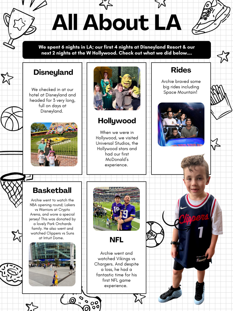 Our Los Angeles adventure was a whirlwind of magic and sports! Archie conquered Disneyland for three full days, braving big rides like Space Mountain. He then lived the ultimate fan’s dream, attending both NBA and NFL games, including the epic Lakers vs. Warriors season opener. From the magic of Universal Studios to the thrill of live sports, it was an unforgettable six-day blast.
